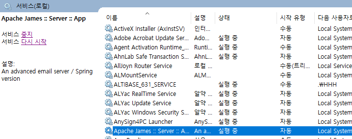 서비스 등록 방법은 /bin 폴더로 이동 후 james.bat install 명령어를 입력해주면 윈도우 서비스에 등록이 된다.